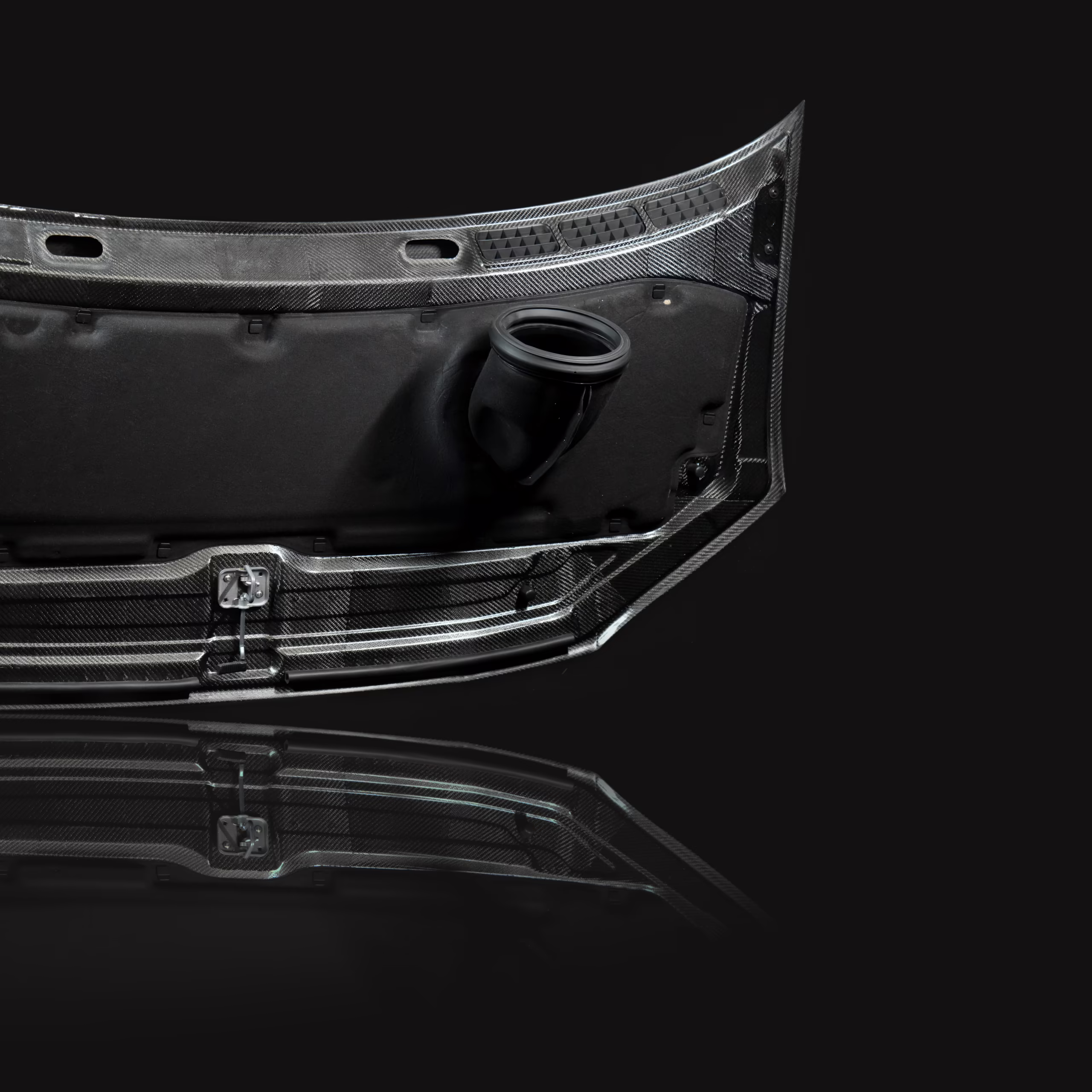Gefertigt aus hochfestem Prepreg-Carbon in Sandwichbauweise, überzeugt die Haube durch massive Gewichtseinsparung gegenüber der Serienhaube, ohne an Stabilität einzubüßen. Das Ergebnis: eine spürbare Reduktion der Frontlast, bessere Fahrdynamik und ein absolut eigenständiger Look, der jedes Fahrzeug aufwertet – technisch und optisch.